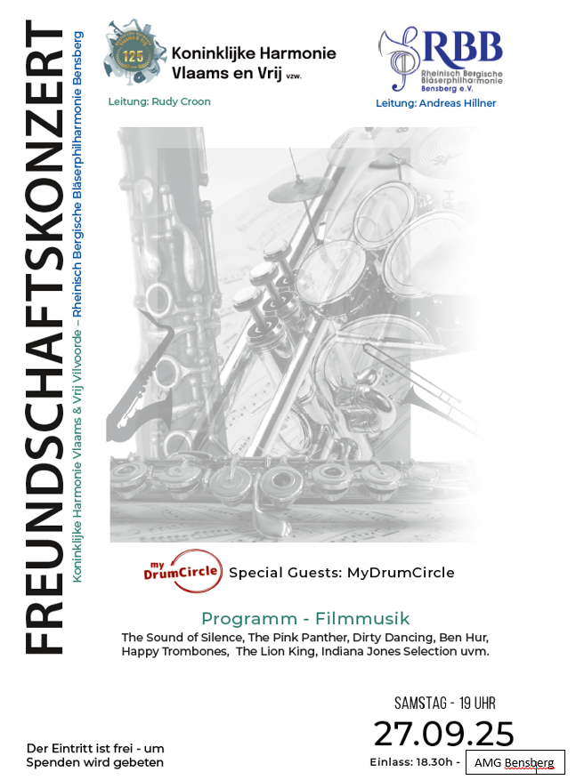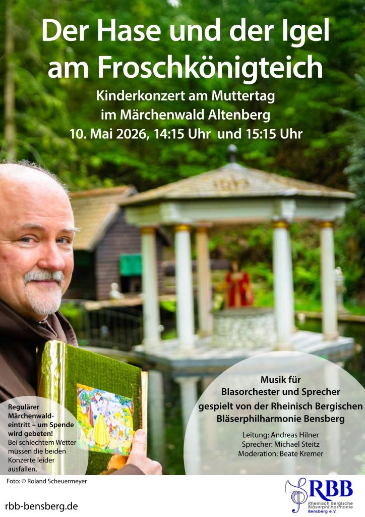 Kinderkonzert der Rheinisch-Bergischen-Bläserphilharmonie Bensbergam Muttertag im Märchenwald Altenberg10. Mai 2026, 14:15 Uhr und 15:15 UhrMärchenwaldweg 15, 51519 Odenthal Regulärer Märchenwald-Eintritt | Um Spenden wird gebeten. Bei schlechtem Wetter müssen die beiden Konzerte leider ausfallen.